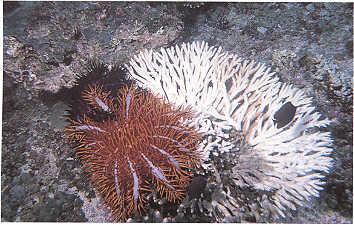 Probably the most publicised natural danger to reef corals world wide has been the Crown of Thorns starfish Acanthaster planci. This is the largest of the starfish, growing up to 0.5 m in diameter and sometimes having more than 20 arms. It feeds exclusively on corals by everting its stomach through its mouth on to the live coral surface and directly digesting the coral's tissue. The Crown of Thorns achieved fame during the 1970's and 80's when it underwent dramatic population increases on many coral reefs in the tropical Pacific, especially on the Great Barrier Reef, Guam, Tahiti and Hawaii. In these and other areas where its population rapidly increased, great numbers of Crown of Thorns starfish virtually stripped large areas of reef of live corals, leaving behind dead coral skeletons.