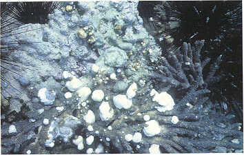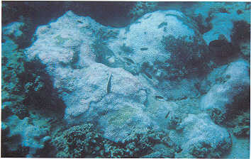 Other isolated disturbances have recently taken place on corals in the Muscat area which are more difficult to explain than Crown of Thorns predation, but which apparently have also occurred in the past. In October 1993 most of the corals at depths of 5 to 10 m in the "Bill's Bumps" bay north of Al Fahl Island showed a condition known as "White Band Disease" in which most of the live tissue on a coral head rapidly decomposes and sloughs off the coral skeleton, leaving a coral head partly alive but with the skeleton partly exposed. On sufaces of corals where this condition has been recognised the exposed skeletonis pure white, but it becomes coated with sediment and algae with time, while the part of the coral which retains tissue continues to grow, resultingin strangely shaped corals with large cavities in their skeletal bases.
