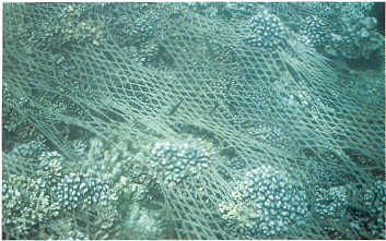 Both White Band Disease and coral tumor formation are interesting conditions that have thus far occurred infrequently in Oman and in isolated circumstances, similar to the manner in which this condition has been reported elsewhere in the world. As such, these diseases cannot be considered important threats to survival and growth of corals or reef development. A more widespread disturbance to corals and reefs that is especially common in Oman is related to the fishing methods that are presently most in use there. The most common method of nearshore fishing is by gill nets which are deployed by the hundreds In shallow nearshore areas and left for long periods of time. When nets break loose from their moorings they may drift onto reefs or areas of coral growth and become entangled on large areas of live corals. Derelict nets are especially common in embayments or on the leeward sides of islands where they come to rest in the quiet water where corals are usually most abundant. In 1992-1994 surveys conducted on the Capital Area shoreline and offshore islands from Ourm to Bandar Khayran more than 27 derelict nets were found on 25% of the 109 transects which were in areas of active coral growth.