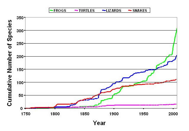 Taxonomic work on the Papuan herpetofauna formally began in 1758 when Linnaeus described two indigenous species of widespread Australasian snakes. The first endemic snake and frog were described by Lesson in 1826, followed by Schlegel's description of the first endemic lizard in 1834. The cumulative number of species increased slowly until the mid-1870s which the pace quickened (see graph below) as biologists began reaching the interior of New Guinea.