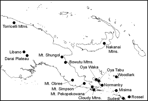We have so far been able to survey 17 localities fairly comprehensively (for a period of 10-30 days each). These localities are scattered around Papua New Guinea but concentrated in the Southeastern Peninsula and adjacent islands because of their especially poorly collected history. We intend to survey an additional 15 localities in the next few years.